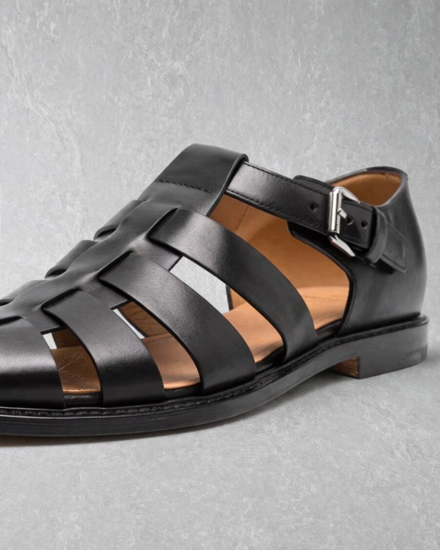 本革を使用したグルカサンダル。通気性を確保する中空構造により、蒸れにくく快適な履き心地を維持。足元に抜けをつくりながらも、レザーの質感で全体を引き締める設計。バックル仕様でフィット感の調整が可能。フラットソールで安定した歩行をサポートする。